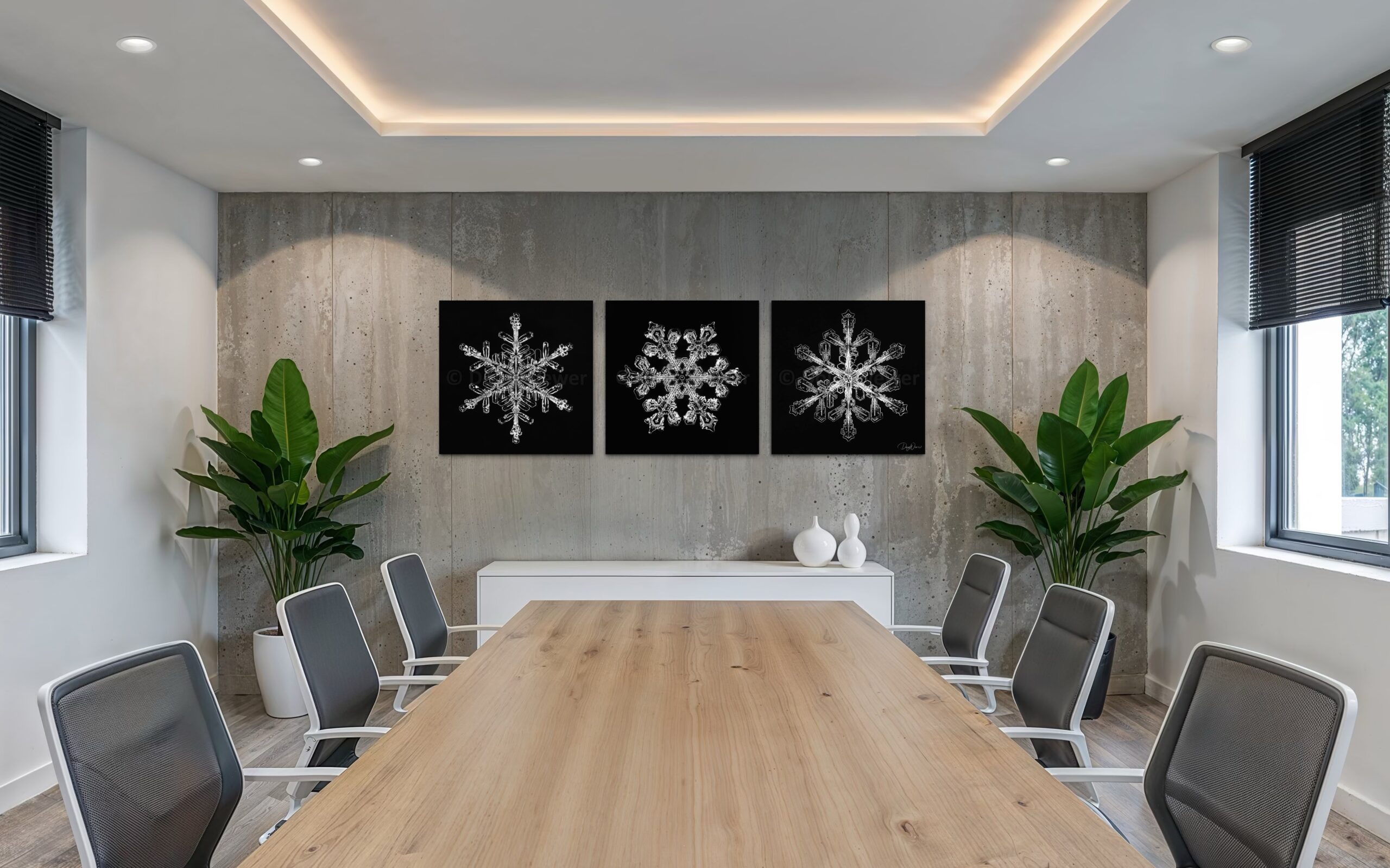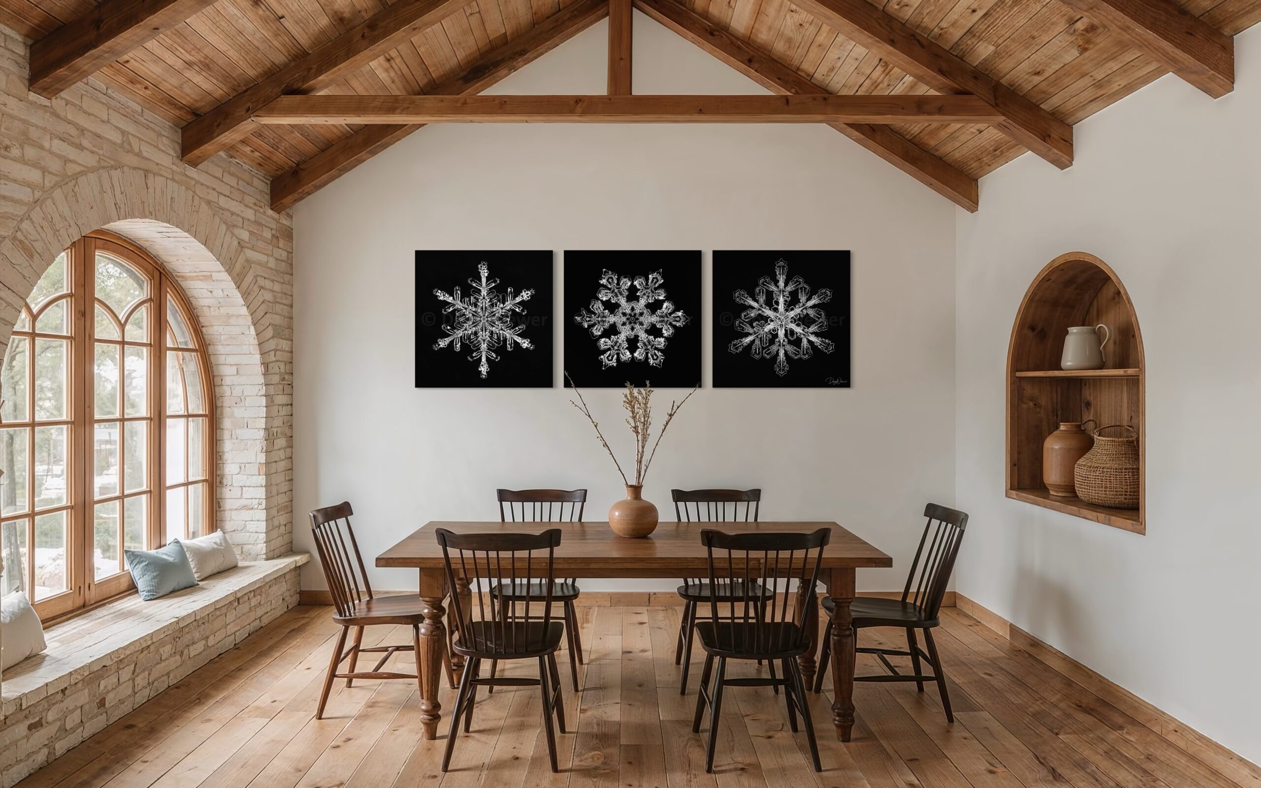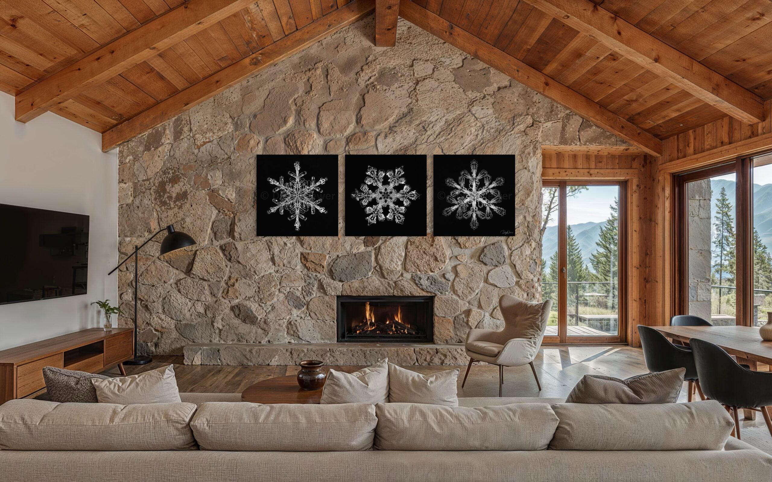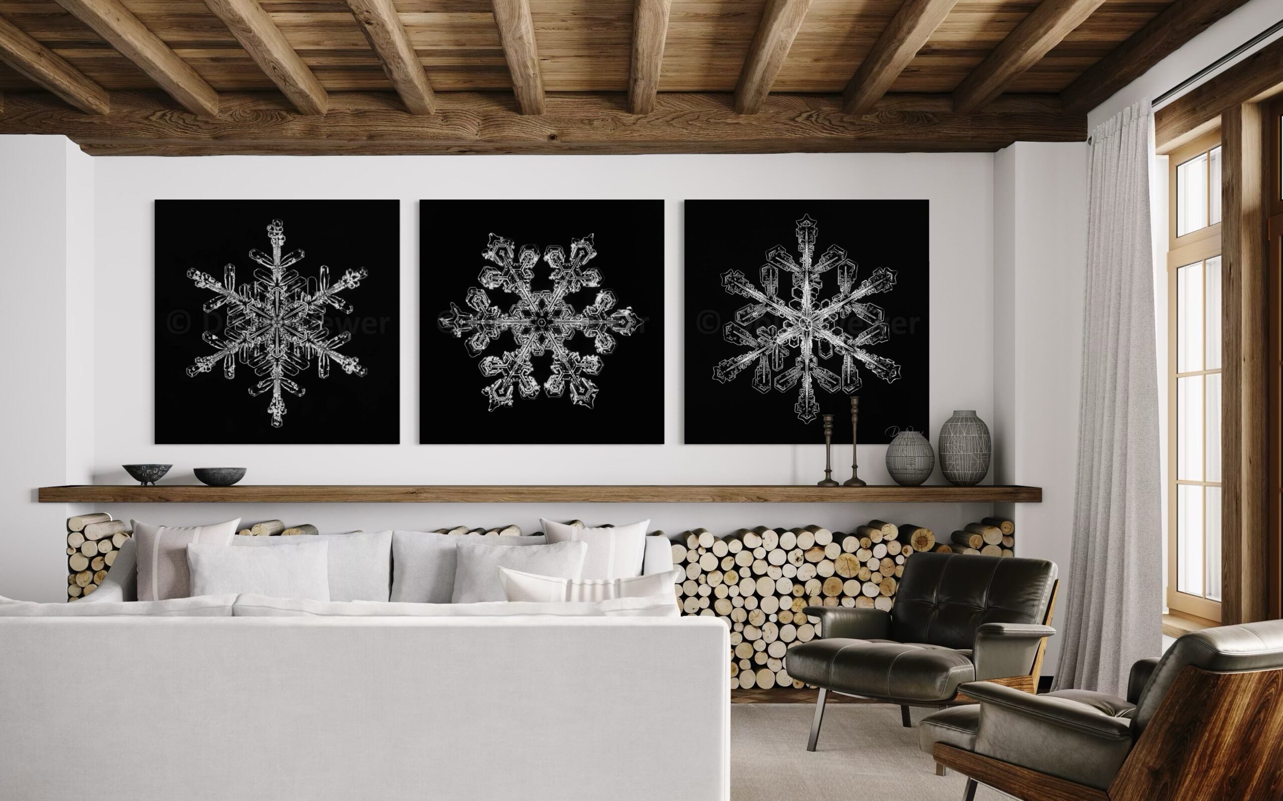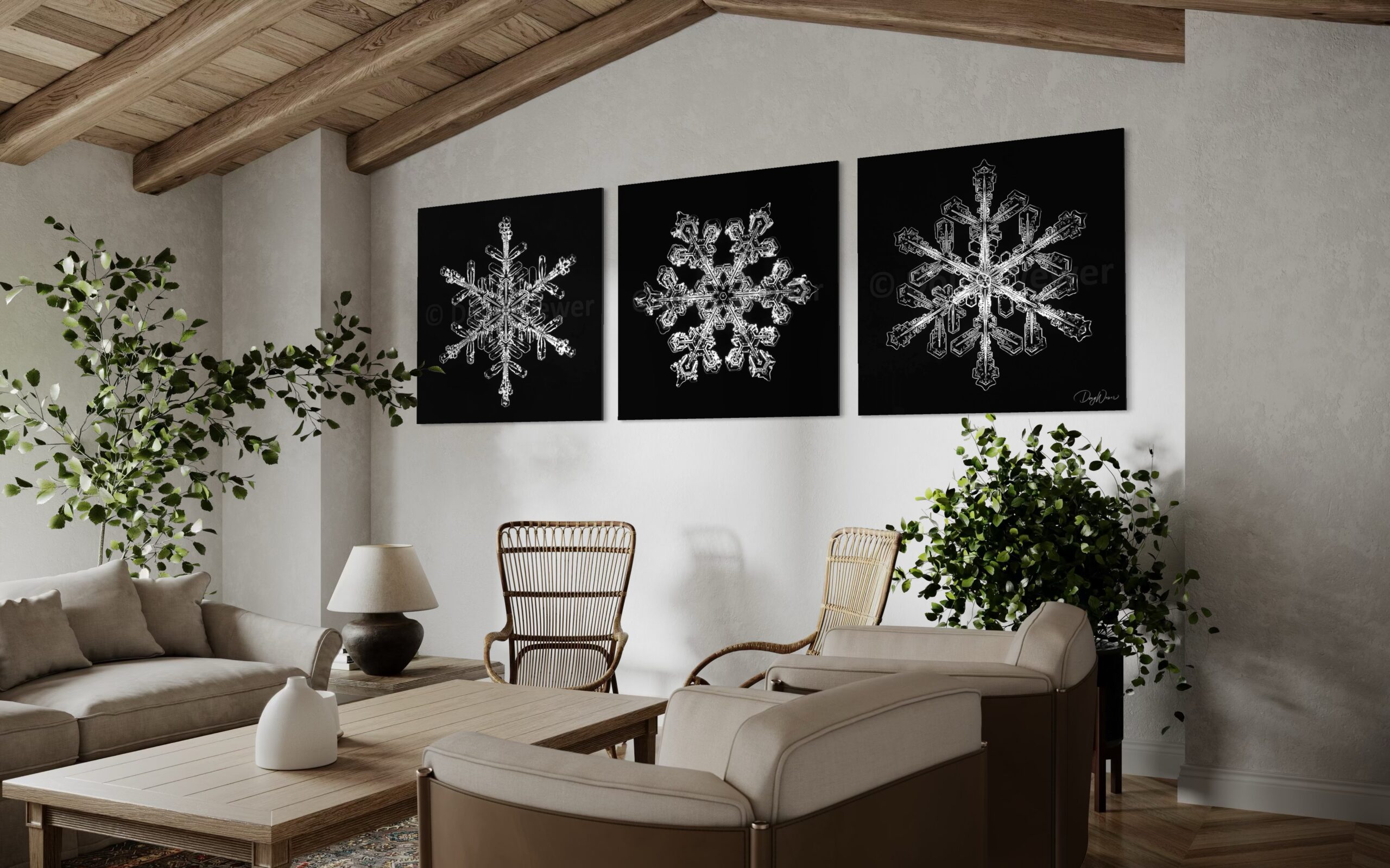 These snowflakes were captured on Opening Day of Powder Mountain’s 50th Anniversary Season. Guests were treated to fresh tracks and a little sunshine. After a beautiful sunset, my daughter said, “Look at these snowflakes!” We stopped skiing and photographed this collection near the bottom of the Sundown lift. The nearly full moon poked through the clouds every now and then to join the night skiing lights in illuminating the fresh snow. The Triptych includes Snowflakes #138, #139 and #143.